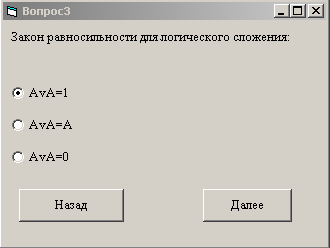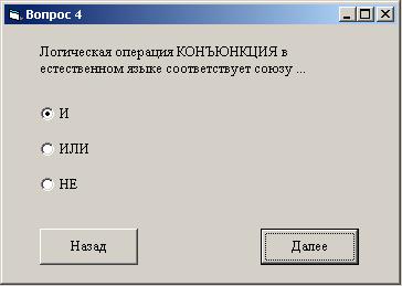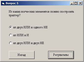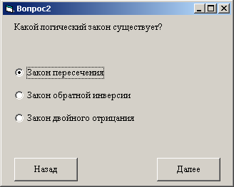 ). Ответив на вопрос, можно последовательно перейти к следующим четырем вопросам, содержащимся на отдельных формах, на каждой из которых также размещены метка, три зависимых переключателя и две кнопки (Назад