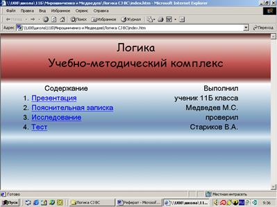 Данный учебно-методический комплекс может быть использован на уроках информатики при объяснении нового материала. Презентация может быть использована для наглядного изучения материала, тест для проверки знаний учащихся, сайт для дистанционного управления составляющими частями курсовой работы, исследования для более глубокого изучения данного материала.