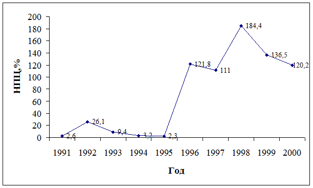 Рисунок 1. Динамика индекса потребительских цен с 1991 по 2000 года (уровень инфляции).[19]