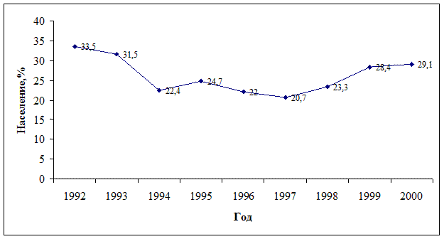 Рисунок 3. Динамика численности населения с доходами ниже величины прожиточного минимума (процент от общей численности).[21]