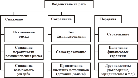 . Их можно разделить на два основных направления, различающихся как целями, так и применяемыми инструментами воздействия: 1) методы предупреждения и ограничения риска и 2) методы возмещения потерь.