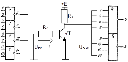 Если , то транзистор VT находится в режиме отсечки. - напряжение на p-n переходе База-Эмиттер насыщенного транзистора (для кремниевых ) Поскольку к выходу ПУ подключены n ТТЛ-элементов, то через резистор протекает не только обратный ток коллекторного перехода транзистора VT, но и n токов . Напряжение на коллекторе транзистора VT, равное напряжению на выходе преобразователя уровней должно быть больше уровня логической «1» ТТЛ-элементов.