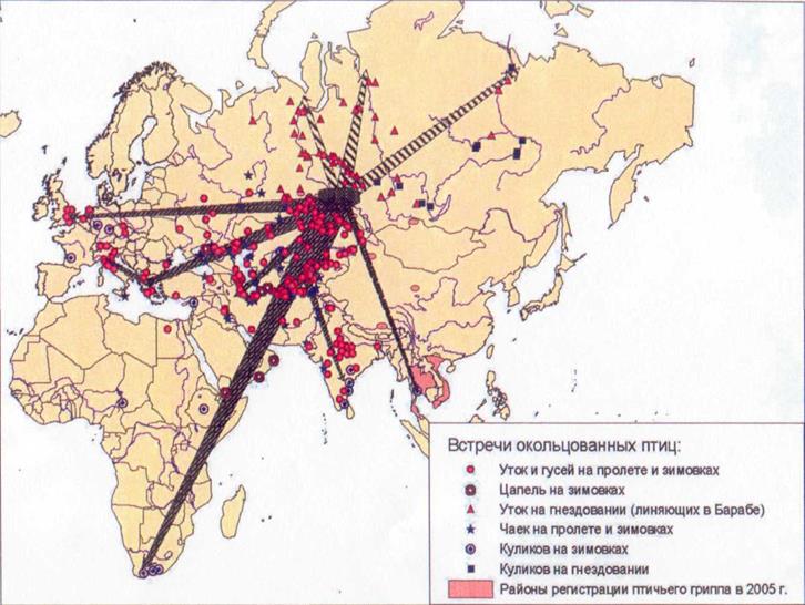 Изучение штаммов ВГП с весенних вспышек птичьего гриппа в окрестностях озера Qinghai в Китае в сопоставлении со штаммами ВГП, выделенными летом 2005 года в России и Казахстане, позволило высказать гипотезу о распространении вируса перелетными птицами. Осенние вспышки птичьего гриппа H5N1 среди птиц в России, Казахстане, Западном Китае, Монголии, Хорватии, Румынии, Турции могут служить подтверждением этого. Генетический анализ изолятов вируса гриппа субтипа Н5N1, вызвавшего вспышки заболевания среди диких и домашних птиц в конце 2005 - начале 2006 года на Украине, в Турции, Хорватии, Словении, Великобритании, Греции, Румынии, других европейских странах и на юге европейской части России также подтверждает указанную гипотезу. В пользу переноса вируса мигрирующими птицами, как основного пути распространения птичьего гриппа говорит и тот факт, что, несмотря на предпринимаемые карантинные мероприятия, заболевание охватывает все новые страны и регионы мира. По информации Всемирной организации здравоохранения и Всемирного эпизоотического бюро птичий грипп (H5N1) подтвержден в Ираке, и еще в 9 близлежащих к России странах: Азербайджане, Армении, Грузии, Египте, Иране, Китае, Ливане, Молдове, Сирии, Турции и Украине. На 1 марта показана гибель лебедей и других птиц от ВГП в Краснодарском и Ставропольском краях, Дагестане, Адыгее, Калмыкии, Кабардино-Балкарии, Чечне.