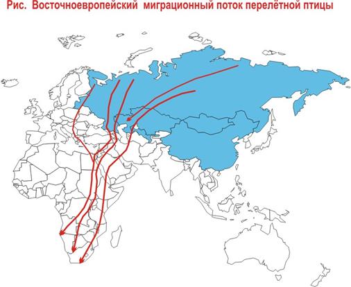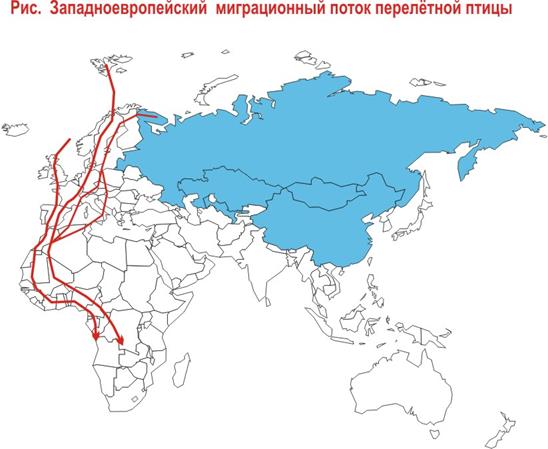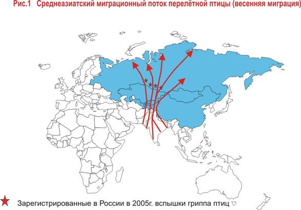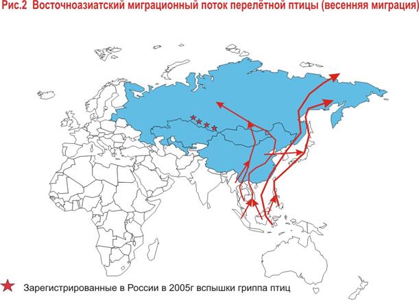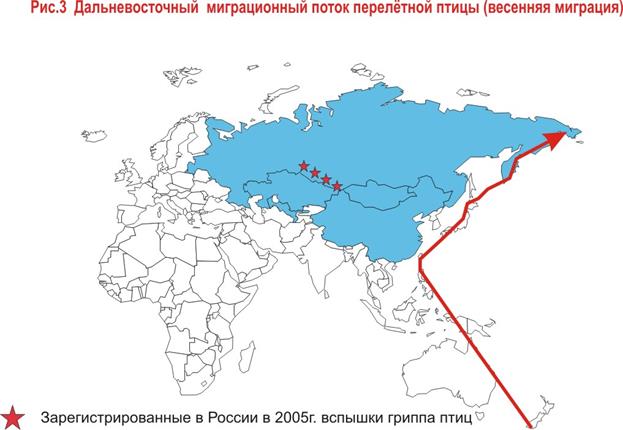 Анализируя ситуацию на территории Российской Федерации по данному заболеванию, четко прослеживается динамика изменения очагов возникновения и угасания вируса, связанная с периодом и путями миграции дикой птицы. Необходимо учитывать в весенне-осенний период пять путей миграции дикой водоплавающей птицы: