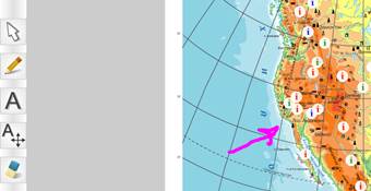 Интерактивные физические карты представляют широкие возможности для выполнения творческих работ по моделированию (нарисуйте систему течений разных частей океана, господствующих ветров, водохранилищ и т.д.) и проектирования (транспортных путей, освоения новых территорий и т.д.)
