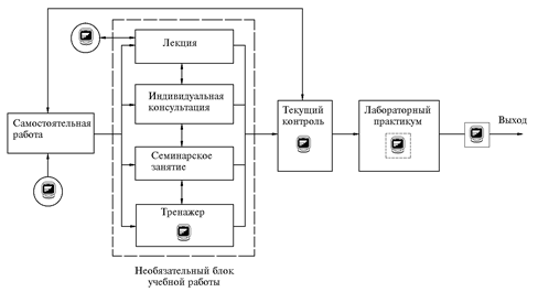 Все виды учебной работы делятся на обязательные и необязательные. Последние помещены на рисунке в рамку, обведенную пунктиром. На схеме не обозначены контрольные работы, которые проводятся после выполнения нескольких модульных программ.