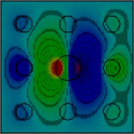 Распределение интенсивности компоненты магнитного поля, перпендикулярного плоскости рисунка, для двумерной фотонной структуры, состоящей из периодически расположенных цилиндров [25]