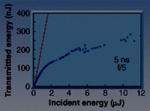 На рис. 12 приведен график прохождения импульсного излучения второй гармоники неодимового лазера с длительностью 5 нс сквозь такую структуру. Из рисунка видно, что уровень ограничения составляет приблизительно 250 нДж при уровне входного излучения 12 мкДж. Следует отметить, что вследствие отражения световое излучение, попадающее внутрь среды, сильно ослаблено и, соответственно, повышается порог разрушения лимитера. Таким образом, фотонно-кристаллические лимитеры обладают большими потенциальными возможностями, причем, изменяя геометрию кристалла и заполняющую жидкость можно создавать устройства для любой длины волны - от УФ до дальнего ИК.