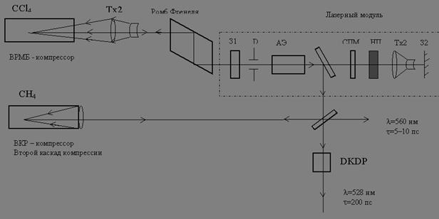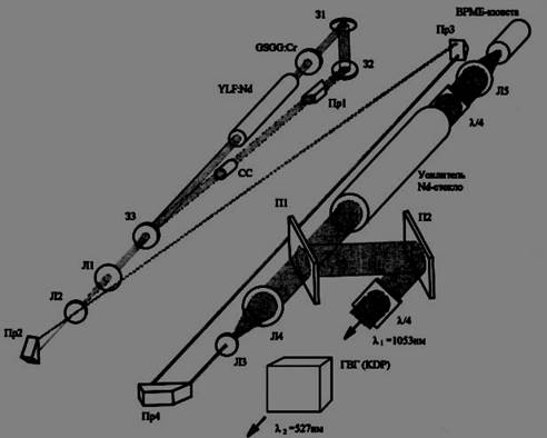Импульсная лазерная система на кристаллах иттрий-литиевого фторида активированных ионами неодима (YLF:Nd) с генерацией излучения на длинах волн ИК (1053 нм), видимого (527 нм) и УФ (351 нм) диапазонов спектра с длительностью одиночного импульса генерации 15…20 нс и энергией до 1 Дж, трансмиссионные (пропускающие) и отражательные голограммы.