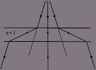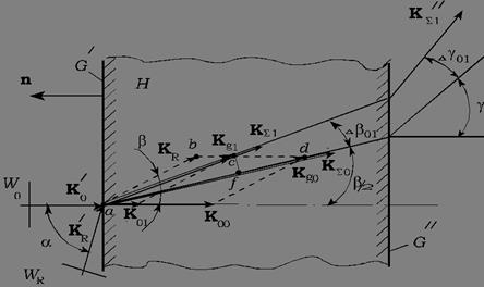 Вдали от запрещенной зоны эффективная проницаемость определяется средней величиной проницаемости элементарной ячейки кристалла. Внутри запрещенной зоны эффективная проницаемость должна быть отрицательна, так как электрическое поле затухает внутрь структуры, и, соответственно, на краю запрещенной зоны должна существовать переходная область, в которой проницаемость обращается в нуль. Как показывают расчеты и эксперименты [37, 38], при падении на такой слой излучения с длиной волны, соответствующей переходной области, пучок света испытывает рефракцию с большим углом, направление которой противоположно классическим материалам с проницаемостью больше единицы (рис. 15). Это явление получило название суперпризмы и