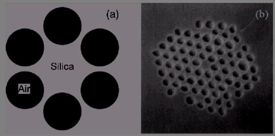 Волноводный эффект в таких структурах осуществляется благодаря внутреннему отражению от периодической структуры «воздух-кварц» и созданию широкой запрещенной зоны для излучения, распространяющегося вдоль такой структуры [41 - 42]. В отличии от обычных волокон, в фотонно-кристаллических расположение и размер воздушных полостей позволяют в широких пределах варьировать их параметры. Микроструктурные волокна сохраняют одномодовый характер распространения с минимальными потерями в широкой области спектра, могут обладают нулевой дисперсией групповых скоростей вплоть до 650 нм [44] (для примера обычные кварцевые волокна не могут иметь нулевую дисперсию ниже длины волны 1.28 мкм).