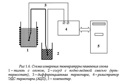 4.1. Потенциометр постоянного тока; нормальный элемент Вестона; батарея питания потенциометра; нуль-индикатор, милливольтметр; термопара; нуль-термостат; печь с тиглем; источник питания печи; регистратор ЭДС термопары.