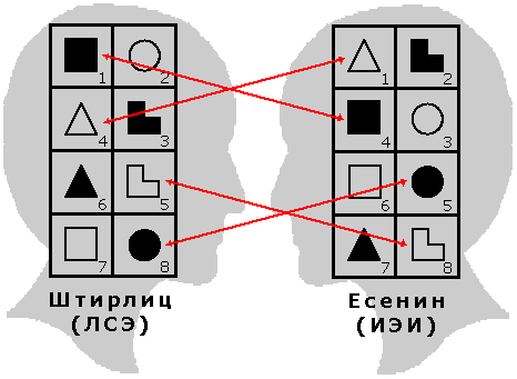У Есенина внушаемая функция – волевая сенсорика , такой человек очень нуждается в "сильной руке", Штирлиц же не может активно проявлять волевую сенсорику, т.к. это его 8-я функция, поэтому Есенин без твердого руководства неорганизован и несобран.