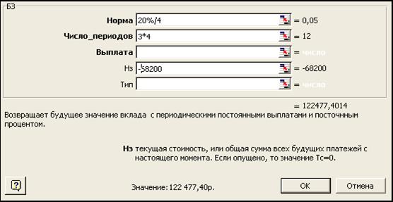 ставке 20% и ежеквартальном начислении процентов будет 122477,40 рублей. Окно расчета функции БС приведено ниже: