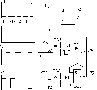Рис. 7.1. JK-триггер: А - временная диаграмма работы, Б - условное графическое обозначение, В - схема с четырьмя ЛЭ И-НЕ