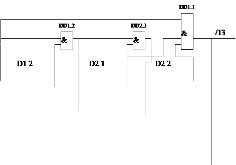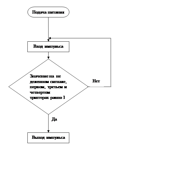 - (Условный блок) Проверка уровня напряжения на не деленном сигнале, первом, третьем и четвертым триггерах на соответствие уровню логической единицы. В случае положительного результата сравнения происходит выход импульса, в случае отрицательного – вход нового.
