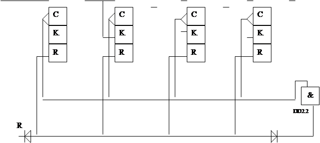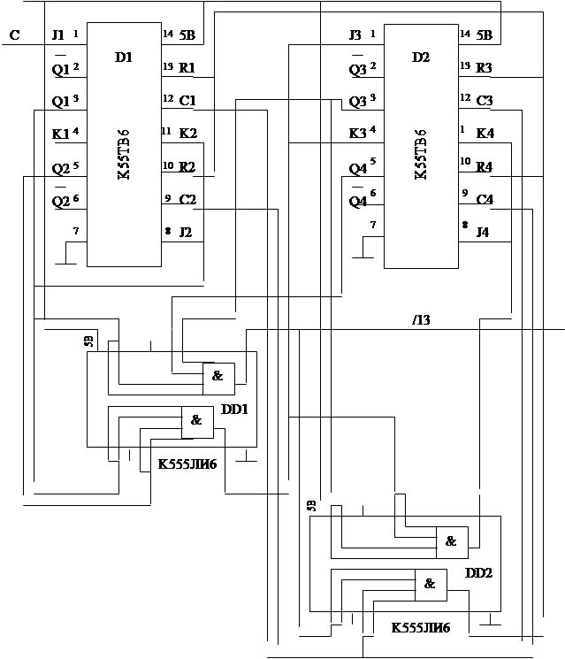 Использовались микросхемы К555ТВ6 (2 JK-триггера без входа S) и микросхемы К555ЛИ6 (логическое И