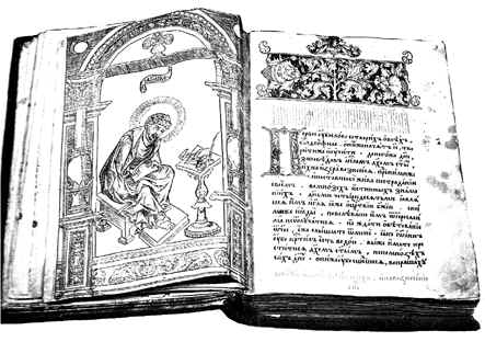 На Руси первые библиотеки появились при монастырях. Первая же сохранившаяся точно датированная книга, написанная на Руси, – это так называемое «Остромирово Евангелие», которое дьякон Григорий переписал в 1056 году для новгородского посадника Остромира. Посадник – самая важная фигура в древнем Новгороде – был, наверное, очень богатым человеком. Евангелие было написано на больших листах, крупным почерком. Оно украшено инициалами, заставками и миниатюрами, с изображениями евангелистов. Правда, Остромир заказывал эту книгу не для себя, а для того, чтобы передать ее в какой-нибудь монастырь, где такими книгами пользовались лишь по самым большим праздникам.