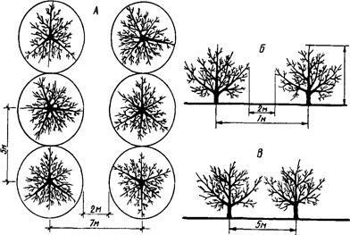 . В садах различных зон нашей страны наиболее распространены округлые кроны. Среди них в загущенных сильно- и среднерослых насаждениях яблони, груши, вишни, сливы, черешни и абрикоса широко применяют разработанную в нашей стране разреженно-ярусную формировку Для персика обычно применяют улучшенную чашевидную крону.
