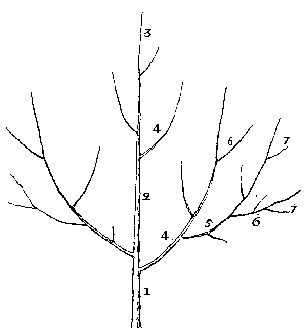 (разработана П.С. Гельфандбейном 1945-1968) крона находит широкое применение в садоводстве она предусматривает сочетание ярусного и одиночного размещения вокруг центрального проводника пяти – семи скелетных ветвей с одним-двумя, иногда тремя порядками ветвления (рис. 6). Крону можно построить по нескольким схемам: 1) нижний ярус состоит из трех скелетных ветвей, второй из двух, выше закладывают две-три одиночные ветви; 2) нижний ярус состоит из трех скелетных ветвей, затем три-четыре ветви располагают одиночно.