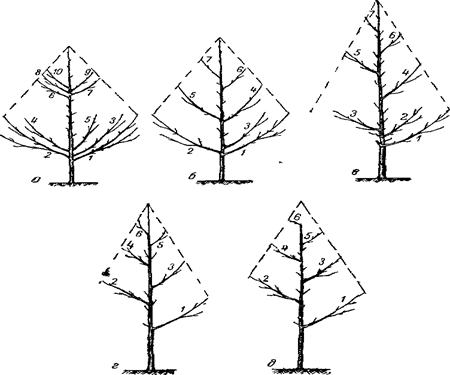 На третий – пятый год на центральном проводнике через установленные интервалы выбирают нужные для закладки очередного яруса приросты и укорачивают их по правилам соподчинения.