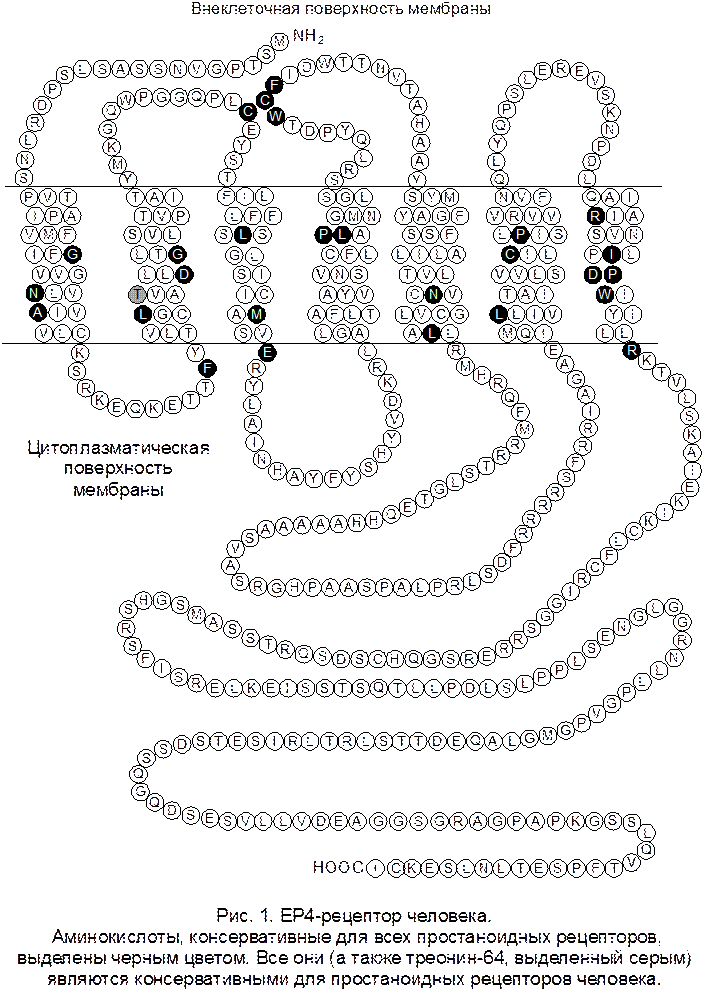 Для всех PG-рецепторов абсолютно консервативными являются 27 аминокислотных остатков; для PG-рецепторов человека — 28 аминокислотных остатков; для ЕP-рецепторов — 40 аминокислотных остатков. На основании этих результатов нельзя сделать каких-либо определенных выводов о пространственной структуре PG-рецепторов. Достоверное моделирование трехмерной структуры PG-рецепторов на основе данных рентгеноструктурного анализа для родопсина также невозможно.