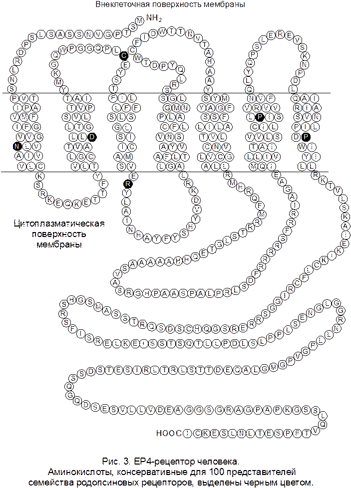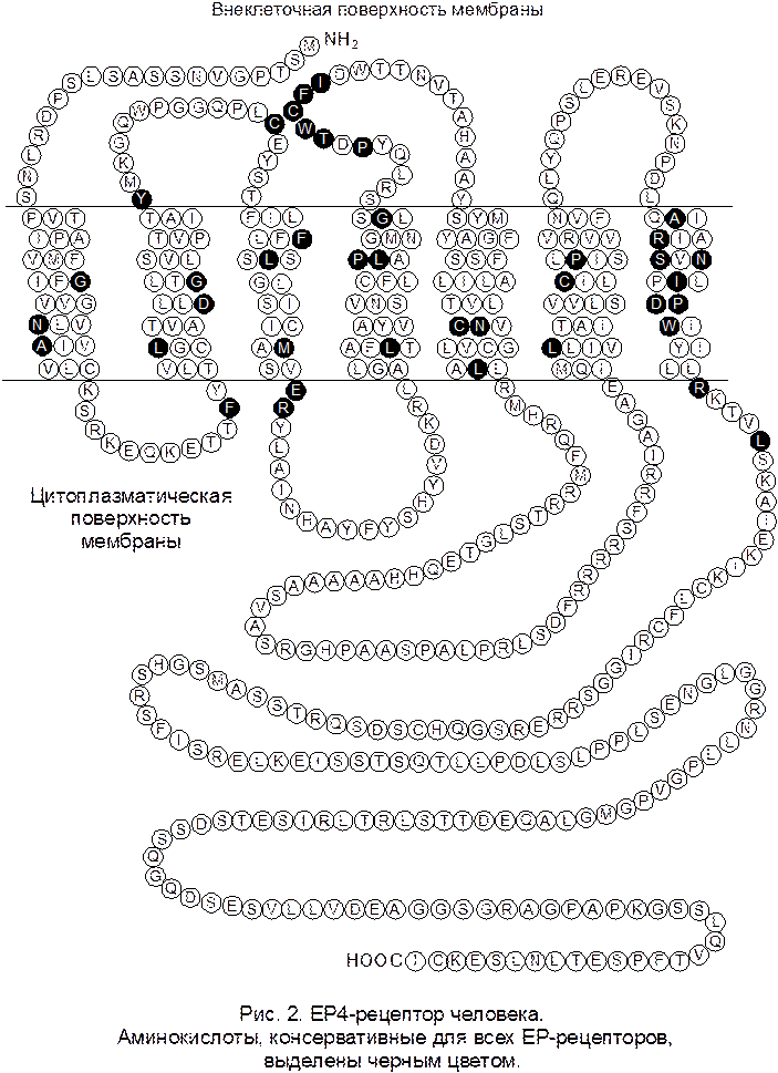 Строение EP4-рецептора человека схематично представлено на рис. 1 – 3. Положение и длина трансмембранных фрагментов, а также наличие дисульфидного мостика показаны в соответствии с данными из базы SwissProt.