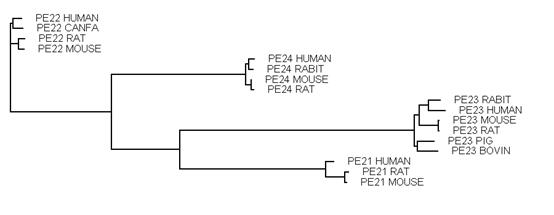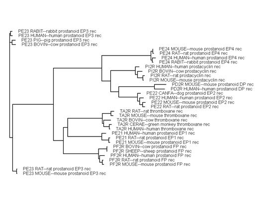 Рис. 4. Филогенетическое древо для простаноидных рецепторов. Корень – EP3-рецептор человека. Получено с помощью программы BLAST (с сервера NCBI) по 34 белкам из базы данных SwissProt.
