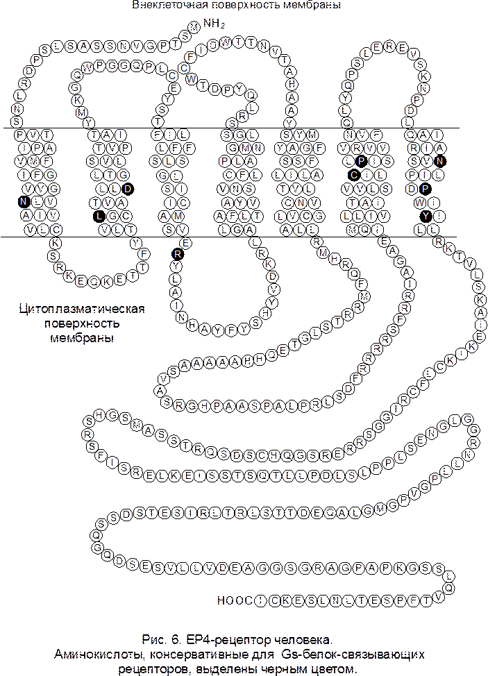 Кроме того, может быть полезным изучение аминокислотных последовательностей внутриклеточных фрагментов PG-рецепторов, так как эти фрагменты участвуют в связывании рецептора с G-белком. Можно предположить, что будет найдена группа консервативных аминокислотных остатков, расположенных в определенной части белка и ответственных за поддержание определенной структуры, необходимой для связывания с G-белком. С одним и тем же типом G-белка могут связываться разные рецепторы; в то же время PG-рецепторы разных типов, лиганды которых достаточно близки друг к другу, связываются с разными типами G-белков. Это значит, что важные для связывания с G-белком участки не входят в состав лиганд-связывающих участков.