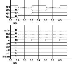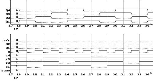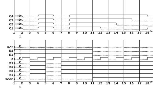 По таблице состояний выходов видно, как осуществляется генерация псевдослучайных чисел: сигналы Q1 и Q3 суммируются по mod2 и поступают на 1-ый триггер. На триггеры 2-4 поступают значения от предыдущих триггеров. Из временных диаграмм также видно, что изменение сигнала на входах Z1-Z4 в данном режиме не влияют на работу схемы, что соответствует выводам, полученным на этапе анализа технического задания.