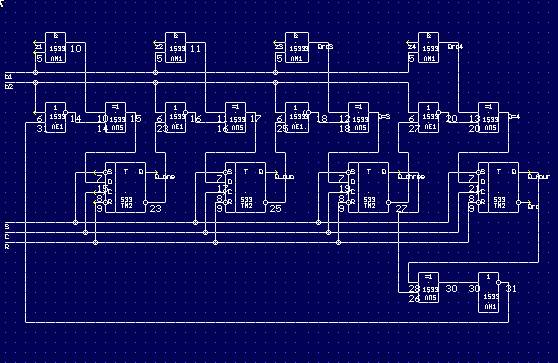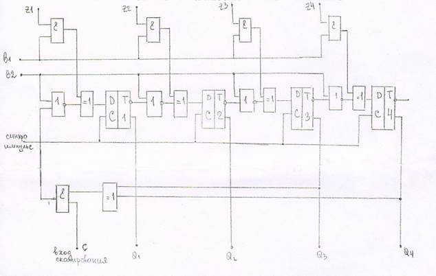Выходы 3 и 4 триггеров складываются по модулю два, а затем с 1 триггером. Чтобы получить на вход 2 триггера сигнал, необходимо сигнал с выхода первого триггера сложить по модулю 2 с входным сигналом z2. Аналогично для 3 и 4 триггера.