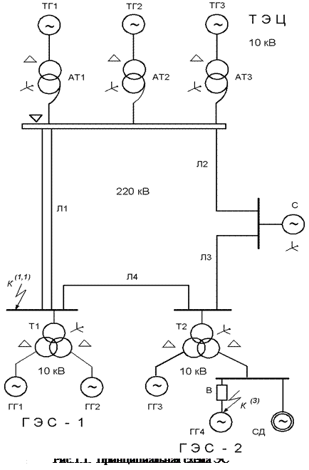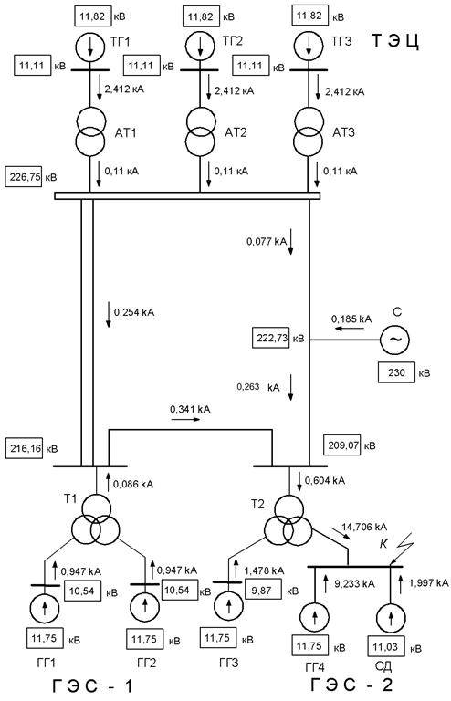 Следует обратить внимание на то, что, благодаря электрической близости СД к месту к.з. и его относительно большой мощности, посылаемый им ток составляет 7,7% от общего тока к.з. ( ), что больше тока подпитки от ГГ3, составляющего 5%, и токов от генераторов ГЭС-1, составляющих 6% общего тока к.з.