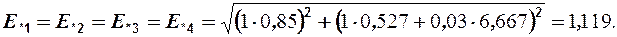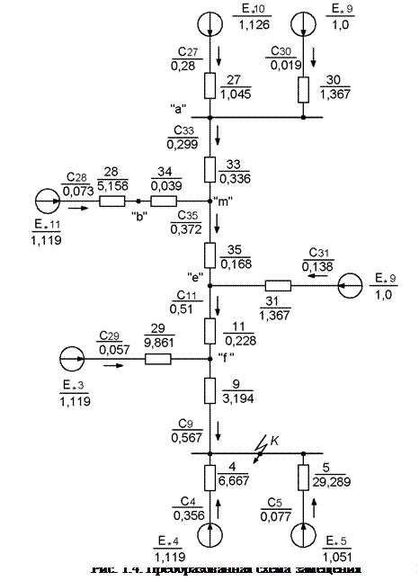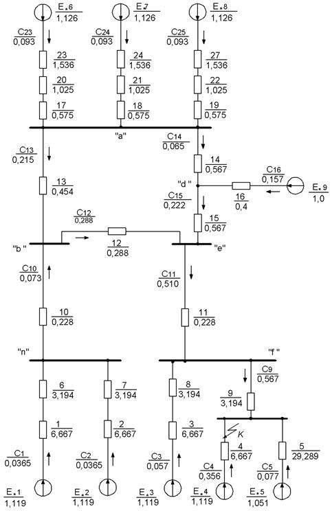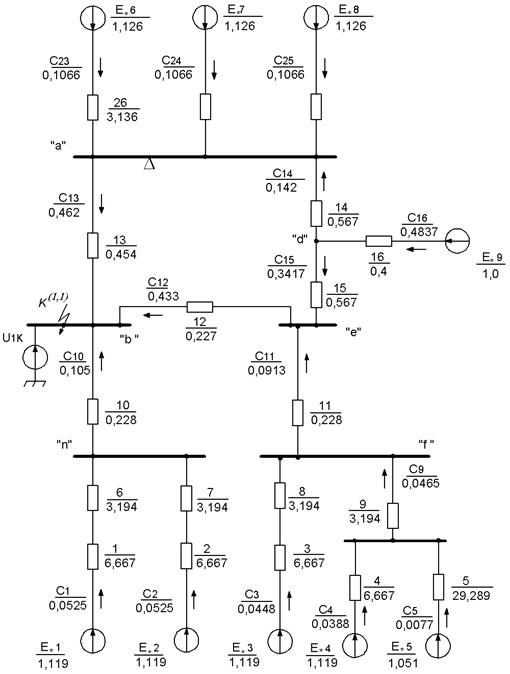 Сопротивление элементов и ЭДС источников питания в о.е. для исходной схемы представлены на рис.1.2.