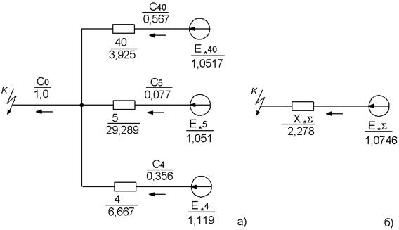 На первом этапе необходимо определить результирующее сопротивление и результирующую ЭДС относительно точки к.з. (узел «b»). В процессе упрощения схемы, как и ранее, сохраняем промежуточные результаты. В качестве исходной позиции принимаем схему (рис.1.4) и максимально используем ранее полученные результаты. По результатам расчета имеем: