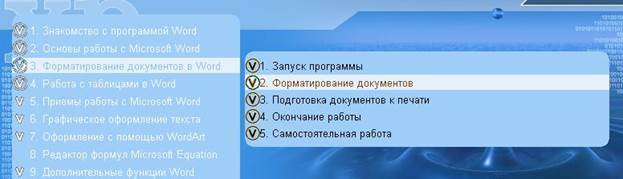 5. Выбрать раздел 3. Форматирование документов в Word, пункт 2. Форматирование документов.