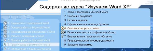 1. Запустить информационный тренинг (Пуск - Все программы - Компьютерный курс «Изучаем Word XP» - «Изучаем Word XP» или нажать двойным щелчком мыши на ярлык «Изучаем Word XP» на рабочем столе)