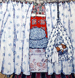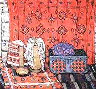Уголок башкирской избы, бревенчатые стены украшены вышитыми полотенцами, сиреневый палас, белая скатерть, В углу мягкой пирамидкой возвышаются подушки. Сюжет полотна прост, даже будничен. Но все в нем рождает ощущение покоя, радости жизни. Оно создается композицией холста, мягкой, словно льющейся пластикой предметов, нежным цветом.Ситдикова любила писать произведения на темы праздников, семейных торжеств. Таковы ее полотна «Натюрморт с башкирскими полотенцами в день сабантуя» (1969), «Праздничный стол» (1974), «В доме гости» (1980) и другие. Автор убеждает зрителя в своем умении трактовать натюрморт как идейно и эмоционально осмысленные композиции, несущие глубокий жизненный смысл, где каждая деталь звучит как откровение души взволнованного художника.В мажорные, поэтичные тона окрашены и произведения Адии Хабибулловны, в которых она рассказывает о повседневной жизни. Она пишет уверенно, свободно, легко. Раскованны по композиции ее холсты, авторская режиссура в них настолько точна, что каждый из них кажется увиденным в жизни.«В далеком башкирском ауле»(1971) - назвала она свой первый триптих, положивший начало серии произведений, объединенных этим названием. Его левая часть - «Будничный день». Изба, как ее увидела однажды художница. Занавеси-шаршау, сундук, домотканные половички, сосуды для кумыса. Здесь живет человек и мы ощущаем его присутствие. Правая часть триптиха - «Курай». Крупным планом показаны висящие на стене вышитые полотенца. На красной скатерти - белая салфетка, чашки с кумысом, курай. В этой композиции преобладает не сюжетное, а поэтическое начало. Вот почему столько внимания отдается орнаментам вышивок, спокойным и величавым ритмам, перекликающимся с мелодией курая. Под кистью мастера оживают предметы, краски - чистые, ясные, озвучивают сцену. Центральная часть - «Сон» изображает безмятежно спящего малыша в люльке на фоне пышной деревенской постели. Этот светлый холст концентрирует идею всего триптиха - уют родного дома, счастье, радость жизни. Пластическое решение холста строится на спокойных, плавных линиях, цветовая гамма - слагаемое белых, голубых тонов.