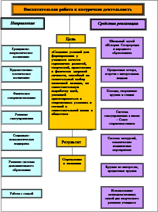 Важную роль в построении воспитательной работы играла организация досуга спортивно-ориентированных подростков, пропаганда спорта и здорового образа жизни. Существующая спортивная материально-техническая база (спортзал, спортгородок, тренажерный зал) позволяет построить спортивно-массовую работу с учащимися согласно необходимым требованиям и запросам школьников.
