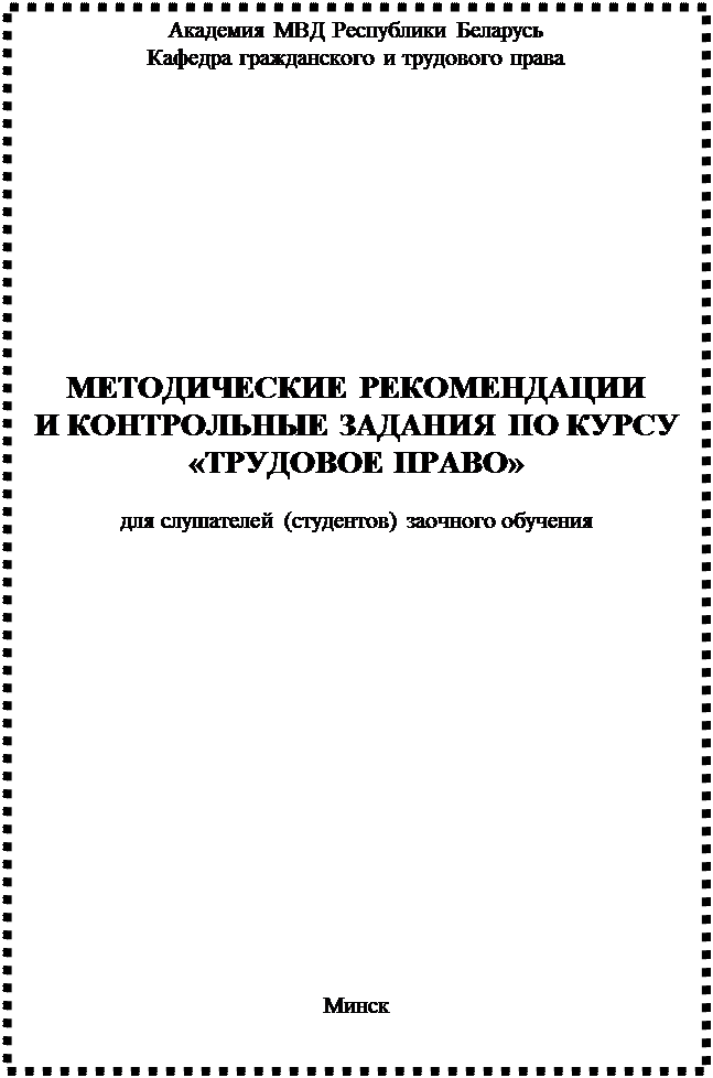 Выполнение письменной контрольной работы является одной из важнейших форм самостоятельного углубленного изучения слушателей (студентами) заочного обучения курса трудового права. Выполнение контрольной работы предполагает изучение учебной и специальной литературы, действующего законодательства Республики Беларусь, правоприменительной практики.
