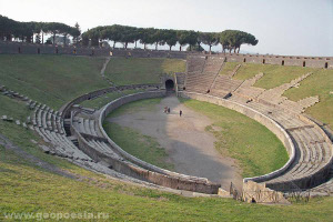 Театр вмещал 1500 человек. А народ попроще приходил в амфитеатр, расположенный под открытым небом. Это массивное сооружение заполнялось двенадцатью тысячами помпейцев. В глубине большой площади возвышался над всеми сооружениями самый крупный в Помпеях храм - храм Юпитера. По обе стороны от него две триумфальные арки.