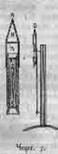 2) Светящие. Светящая ракета (черт. 13) делается диаметром 3 дм. и отличается от боевой устройством головной части, где над глухим составом (1) помещается медный кружок (2) с припаянной к нему медной трубкой (3), набитой медленно горящим составом и укрепляемой серной обливкой (4). К переднему концу гильзы прикрепляется ;