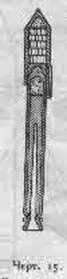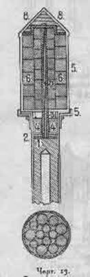 3)  Ракеты со звездами. На черт. 8 и 15 показаны разновидности фейерверочных ракет, именно, начиненных цветными звездами. Они похожи по устройству на светящие ракеты. В верхний конус их кладется заполнение из бумаги или войлока, на него — картонный кружок, и далее — цветные звезды, пересыпанные пороховой мякотью. Далее идет звуковой заряд и, наконец, пороховой заряд с каналом и хвост, длина которого равна 7—8 длинам гильзы.