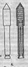 На верхнюю часть ракеты надевают или прямо картонный колпак или шатрик Н, если назначение ракеты только взлететь, или еще, между ними, промежуточный цилиндрик, шубу (k), заполняемый шлаговым (производящим выстрел) или цветным составом. Внизу, в шейку ракеты, вставляют запал, быстро горящий зажигательный шнур, вложенный в тонкую гильзу и приклеенный к ракете. Затем к ракете привязывают хвост (см. черт. 7), состоящий из тонкой палки. Вес и длина хвоста определяются условием, чтобы центр тяжести ракеты с хвостом отстоял от нижнего конца (где шейка) ракеты на 1—3 cm. Диаметр и длина малых ракет 1,6 cm и 27,5 cm, больших — 2,5 cm и 35 cm.