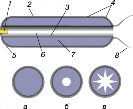 жестяной колпак (5), наполненный кусками (6) светящего состава (селитра + сера + антимоний) в виде цилиндриков, впрессованных в бумажные гильзы; на концах цилиндриков сделано по углублению, заполненному пороховой мякотью, в промежутках между цилиндриками пропущен стопин (7), один конец которого продевается через отверстие в дне жестянки и вставляется в медную трубку (3), другой же укладывается поверх цилиндриков. Перед прикреплением крышки (8) колпака пространство, оставшееся над цилиндриками свободным, заполняется войлоком. Ракета весит около 16 kg и и освещает местность около 0,5 km диаметром. Дальность — 1 km. Время освещения 1/4 мин.
