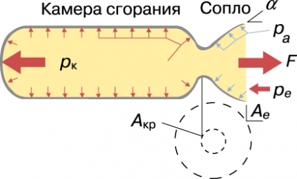Любой ракетный двигатель состоит из двух основных частей: камеры сгорания и сопла. Камера должна иметь достаточный объем для полного смешения, испарения и сгорания компонентов топлива. Сама камера и система подачи топлива должны быть спроектированы таким образом, чтобы скорость газа в камере была ниже скорости звука, иначе горение будет неэффективным. Как и в случае надувного шарика, молекулы газа соударяются со стенками камеры и выходят через узкое отверстие (горловину сопла). При стеснении потока газа в сужающейся части сопла его скорость возрастает до скорости звука в горловине, а в расширяющейся части сопла поток газа становится сверхзвуковым. Сопло такой конструкции было предложено Карлом де Лавалем, шведским инженером, работавшим в области паровых турбин, в 1890-х годах.
