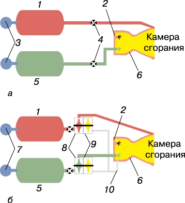 СИСТЕМЫ ПОДАЧИ горючего и окислителя в камеру сгорания ЖРД: а – вытеснительная; б – насосная. 1 – бак горючего; 2 – форсунки смесительной головки; 3 – баллоны с газом высокого давления; 4 – клапаны; 5 – бак окислителя; 6 – рубашка охлаждения; 7 – баллоны с газом низкого давления; 8 – насосы; 9 – турбины; 10 – отбор горячего газа на привод турбины.