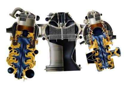 МАРШЕВЫЙ ДВИГАТЕЛЬ «ШАТТЛА». Слева – основной ТНА горючего; в центре – камера сгорания; справа – основной ТНА окислителя. Газы после турбин через коллектор подаются в камеру, куда впрыскивается основной расход окислителя.