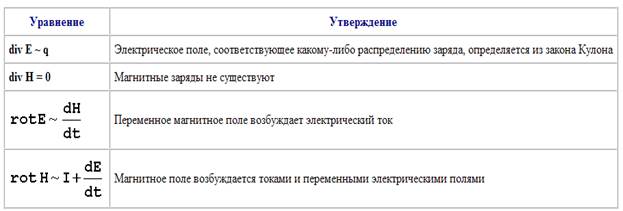 Система уравнений для электрических и магнитных полей, разработанная Максвеллом, состоит из 4-х уравнений, которые эквивалентны 4-м утверждениям