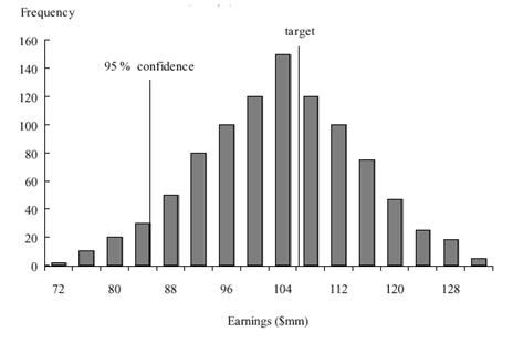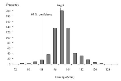Диаграмма 3.1 описывает 12-месячное распределение дохода для компании, которая испытывает влияние изменения цен на сырье. Как показано, плановая норма доходов компании на 12-месячный период - $105 млн. Риск дохода (Earnings-at-Risk) (EaR) из-за риска, связанного с ценами на сырье, - $25 млн. при доверительном уровне 95%. Диаграмма 3.2 также показывает 12-месячное распределение дохода для той же самой компании, но предполагает, что компания заключила контракт, страхующий часть товара от воздействия изменения цен на сырье.