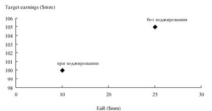 Используя EaR для измерения риска, связанного с хеджированием или отказом от него, компания может рассмотреть, является ли, благодаря хеджированию, $15 млн. уменьшение в нестабильности доходов (EaR от $25 млн. до $10 млн.) достаточно выгодным при условии $5 млн. уменьшения ожидаемого дохода. Другими словами, компания ожидает либо заработать $105 млн., не используя хеджирование(с возможным самым плохим доходом $80 млн. с доверительным уровнем 95%), или $100млн., хеджируясь (с самым плохим доходом $90 млн. с доверительным уровнем 95%). Одна из выгод корпоративного управления риском состоит в увеличении дохода путем определения рисков, связанных с альтернативными деловыми решениями и, таким образом, помогая фирме установить, что является для нее соответствующим профилем риска, независимо от того, примет ли окончательное решение форму уменьшения или увеличения риска фирмы.
